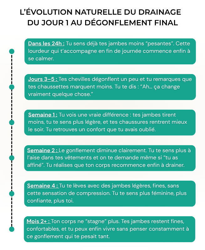 Les premiers changements visibles (moins de marques de chaussettes, chevilles moins gonflées) apparaissent entre 3 et 7 jours.