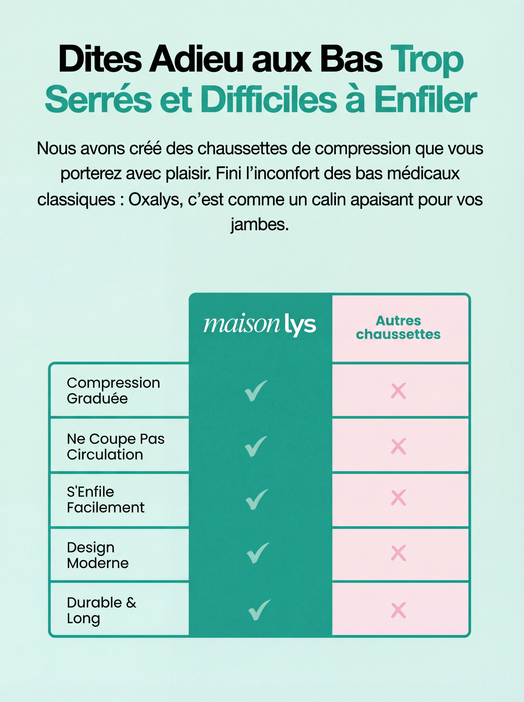 Maison Lys utilisent une compression graduée 15-20 mmHg calibrée médicalement. Elles enveloppent vos mollets sans les serrer et stimulent la circulation. Fini les chevilles qui doublent de volume le soir.