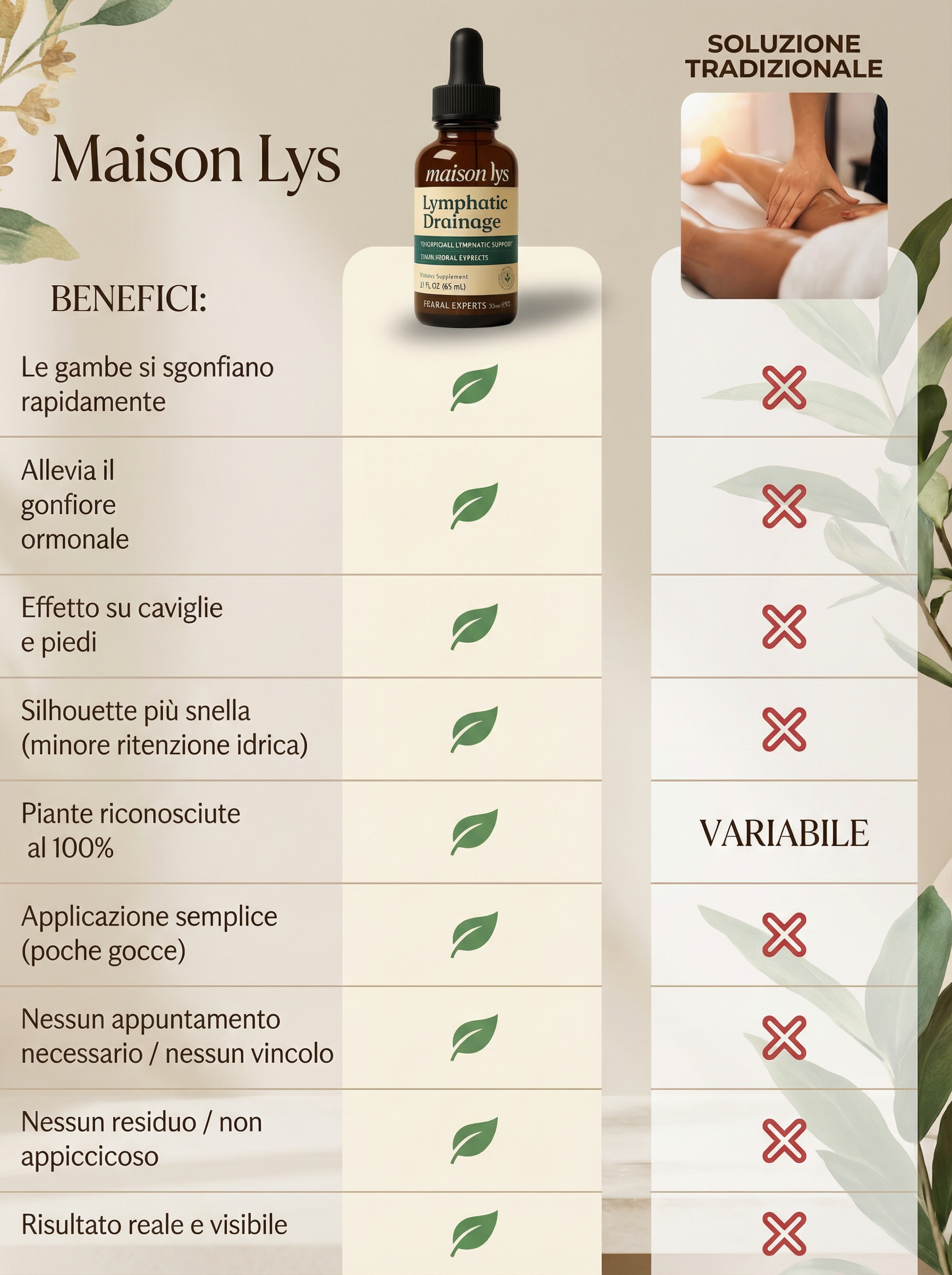 Maison Lys utilizza una sinergia di piante riconosciute per favorire il drenaggio linfatico e ridurre i gonfiori:
